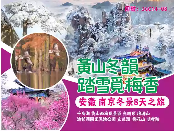 黃山冬韻、踏雪尋梅、千島湖安徽南京雙飛8天