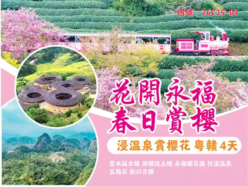 花開永福春日櫻花、福建土樓奇秀五指石閩粵高鐵4天