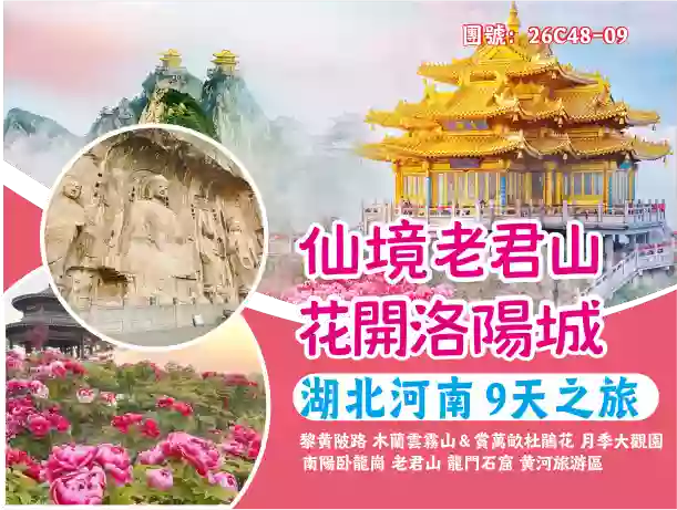 仙境老君山、花開洛陽、春賞國色牡丹、龍門石窟、湖北河南9天之旅