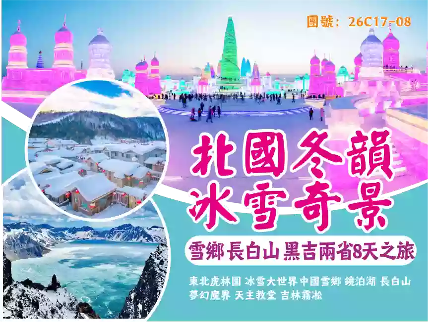 北國冬韻冰雪奇境、東北雪鄉、長白山、鏡泊湖、霧凇黑吉兩省直航8天